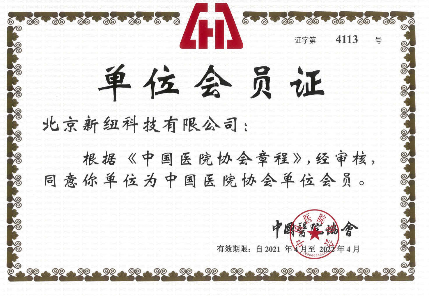 热烈祝贺北京新纽科技有限公司成为 中国医院协会会员单位
